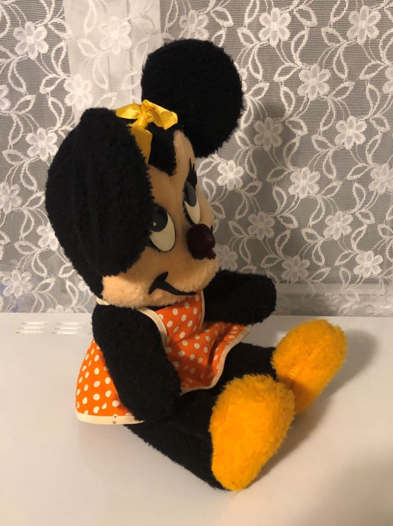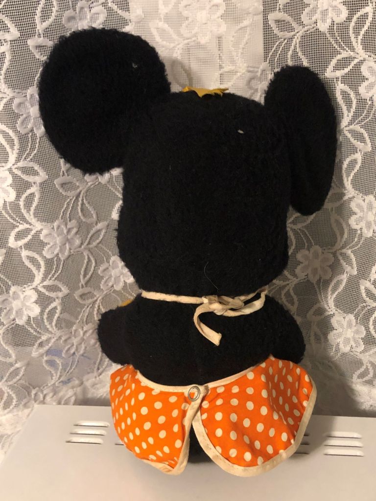 I don’t have a lot of information on this vintage Minnie Mouse plush without its original tags. There are literally tens of thousands of Minnie plushes out there, and without the tags, it’s impossible to date or categorize her. Or… is it?
