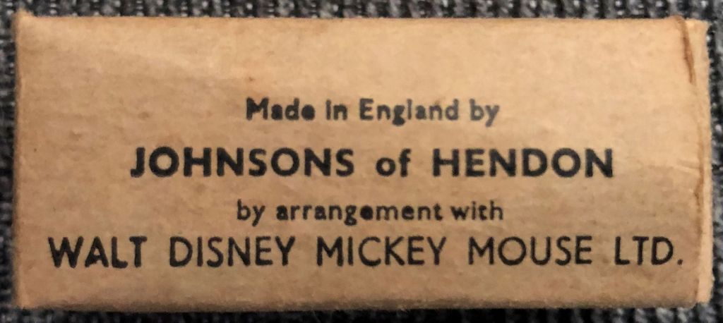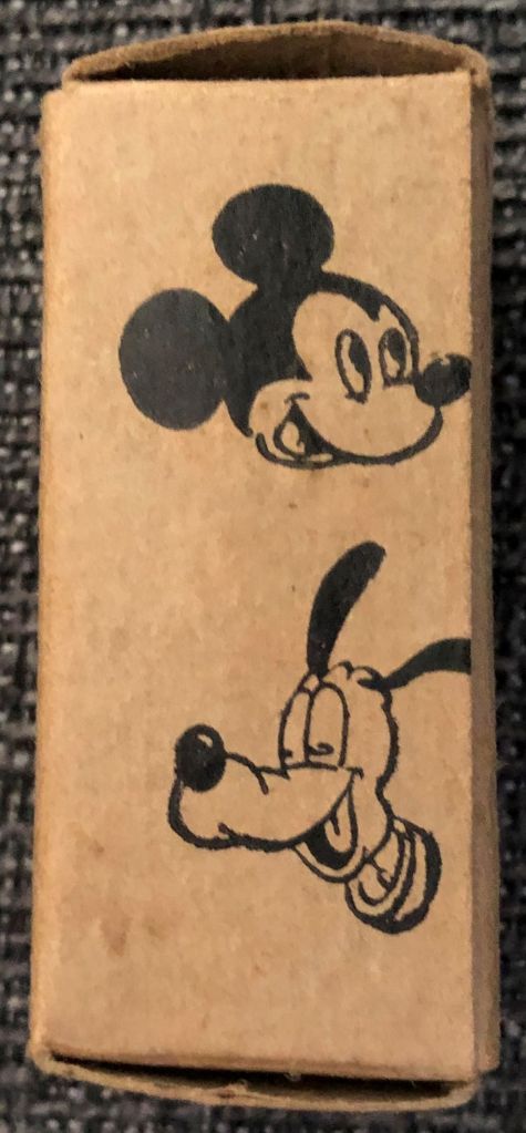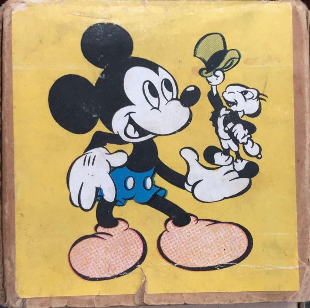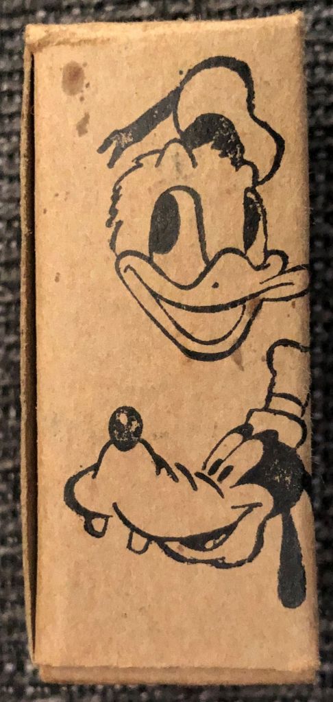 Another way to date merchandise is from the characters that are included on the packaging and those that are not. In this case, Jiminy Cricket (1940) and Bambi (1942) appear on the box but Cinderella (1950) does not. This correlates the dating of the Lantern to between 1943 and 1948.