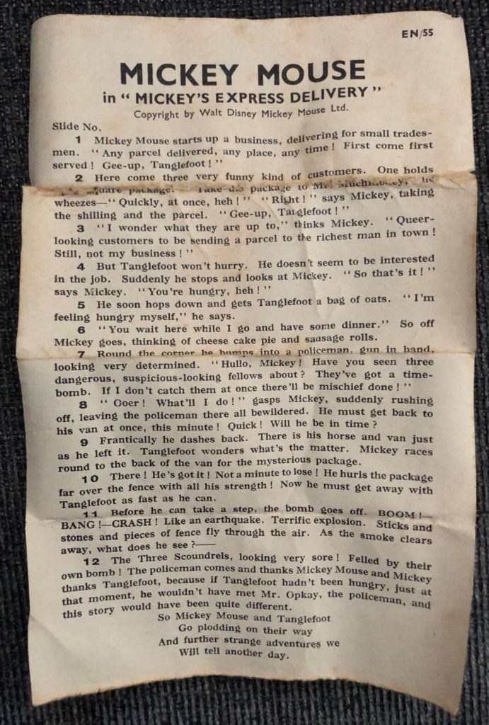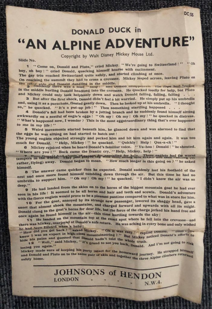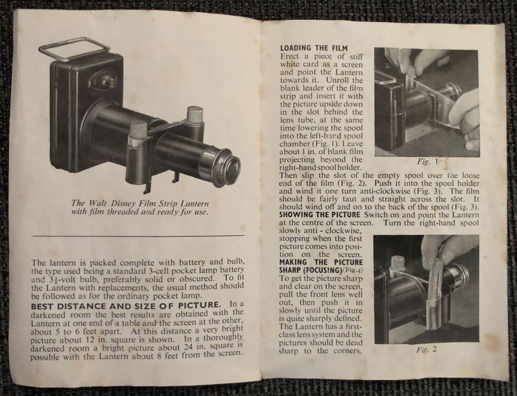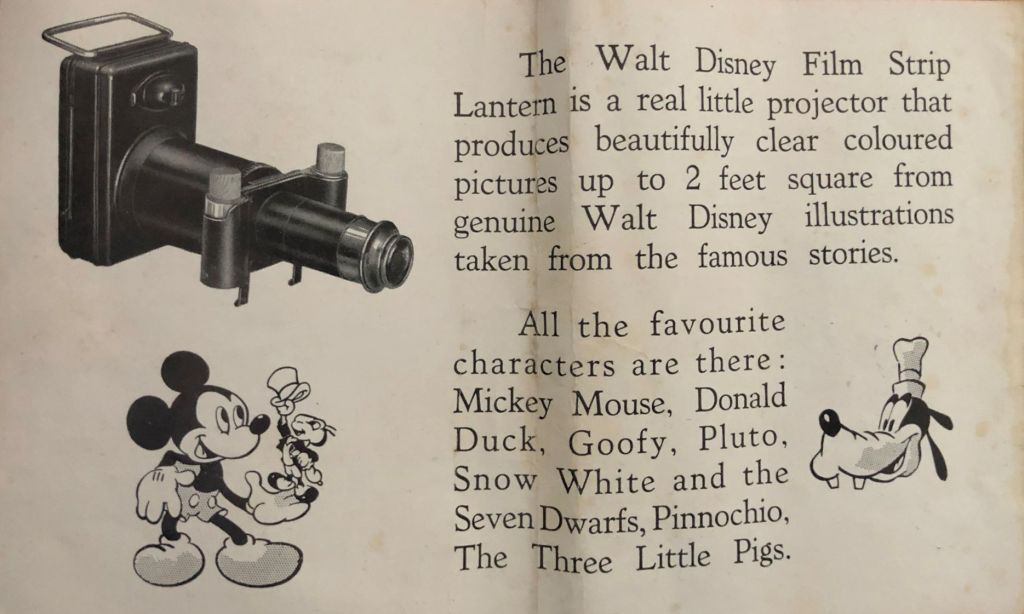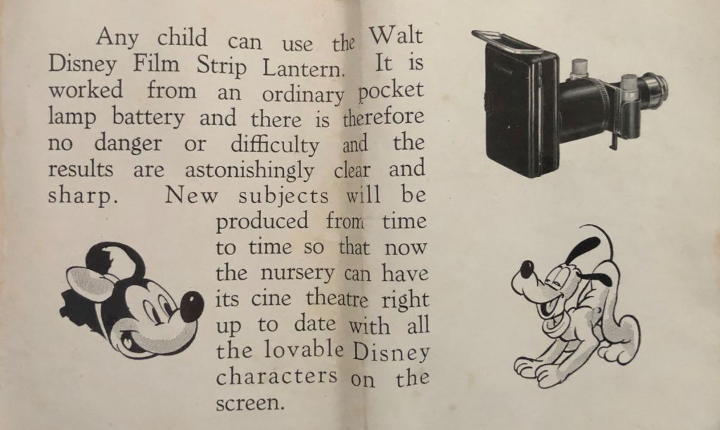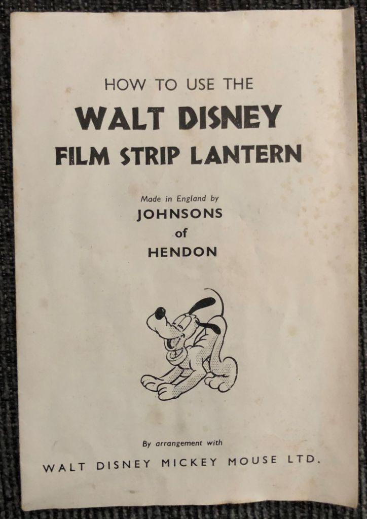 It’s one thing to find a vintage device that works and quite another to find it with all of the original documentation! To begin with what I have, you can see and read the advertisement flyer for the Walt Disney Film Strip Lantern below: