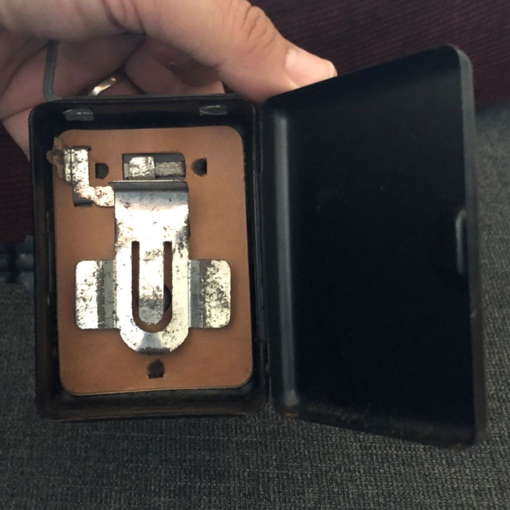 Dusty and dingy but intact and hopefully working! I will need to source a battery to check. You can see images of the battery compartment, the bulb (of which I have four) and the wooden rollers used to advance the film strips below: