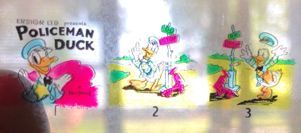 The titles of the films and scripts don’t always match exactly but the stories do gel. Although there were 24-frame stories, mine are divided into two 12-frame stories on each strip of film. So each script page has a story on one side and another story on the other side to coincide with the film strip it came with.