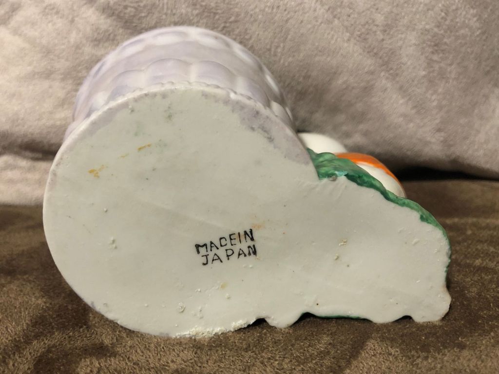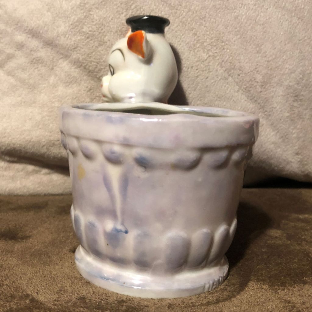 This planter sports a simple design but does have some nice bright colours. I like that it has ‘Made in Japan’ imbedded in the side of the base as well as printed on the bottom. It likely dates from the 1940s.