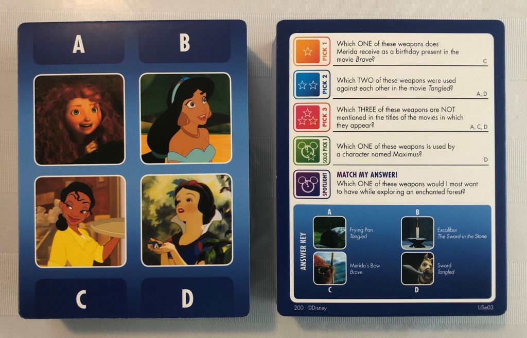 According to the official description, this game lets you discover playful trivia spanning decades of the Disney company, from animated classics and blockbuster movies, to television hits and dazzling theme park destinations. It’s a game of teamwork but with a competitive twist! Along the way are guess-my-answer questions that reveal how much you know about the other players.