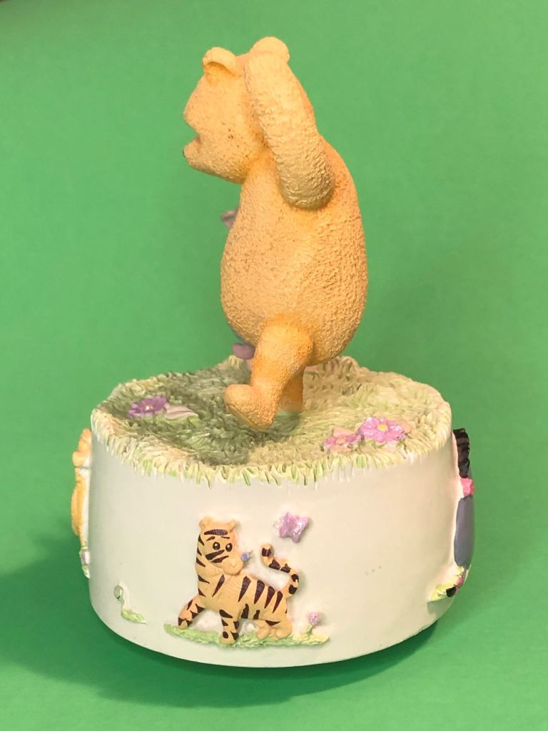 The base of this musical figurine is decorated with some of the more famous inhabitants of the 100-Acre Wood, such as Tigger and Eeyore, along with Pooh and Piglet, of course. However, I wonder why the pair that features so prominently on the top of the stand are repeated below when characters like Owl, Rabbit, or Kanga and Roo could have been used?