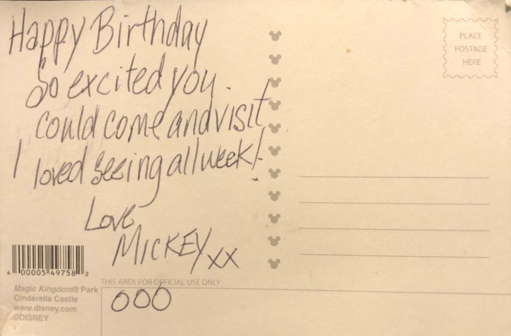 The interesting thing with this card is the message. At first you might think that it was also a promotional piece due to the content itself, a nice inscription from Mickey Mouse himself to someone who was having a birthday at the Park. Maybe something you could pick up at Customer Service just inside the Park. But looking closer, you see that ‘Mickey’ left out the word ‘you’ in the second sentence, which means it is more likely that Mom or Dad was trying to make their child’s day more magical by pretending to be the Mouse. And they would have gotten away with it to if some pesky blogger hadn’t spotted the mistake!