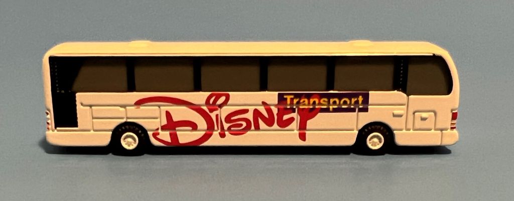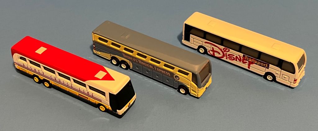 These are diecast models with quite a nice level of detail. Note that the top bus, the Disney Transport, has only one rear axle, whereas the other two buses have dual rear axles. It’s always nice when the designers take the time to be that authentic!
