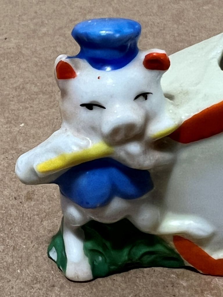 Most stills from the 1933 theatrical Short The Three Little Pigs have Piper Pig wearing black and Fiddler Pig wearing the blue Sailer suit. Subsequent media interchanges the two pigs, swapping the instruments of the pipe and the violin between the two without any explanation. Maybe it was laundry day and Piper had to borrow his brother’s clothes?