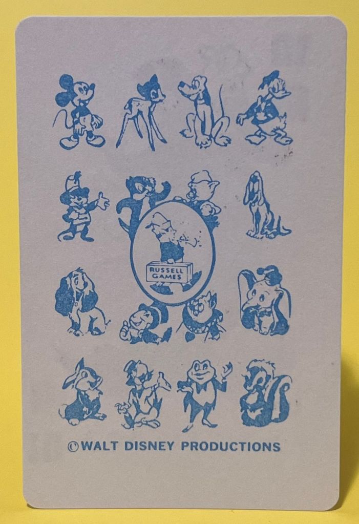 The card backs have a nice assortment of Disney characters that have nothing to do with the game. It may help us to date the game, however. The newest characters on the card are from Lady and the Tramp (1955). Walt Disney Productions ended in 1987 as a branding copyright. There is an earlier version of this exact card game dating from 1946 but with different packaging. After some research and from my own knowledge, I’d say this was produced sometime in the 1960s.