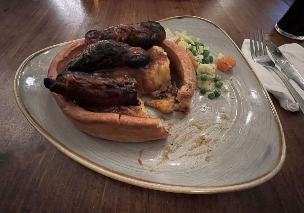 Three large pork sausages on a bed of mashed potatoes swimming in gravy in a Yorkshire Pudding bowl with a side order of peas and carrots with diced onion. For the uninitiated to the weird and wonderful world of British cuisine, here is a definition of Yorkshire Pudding: