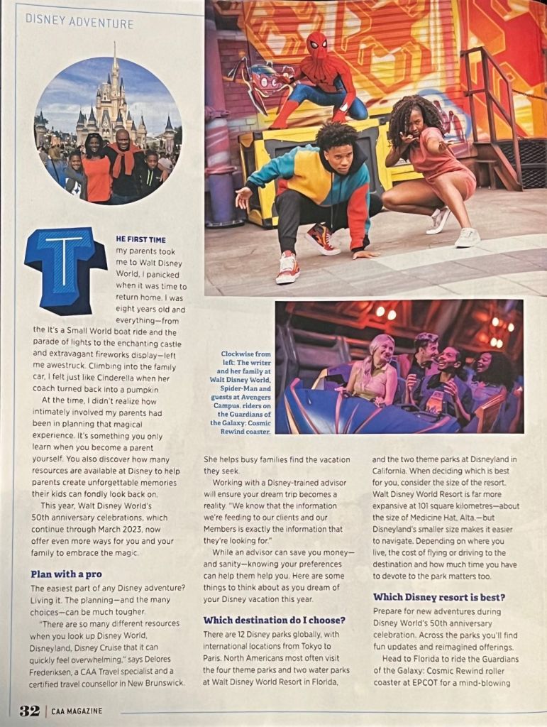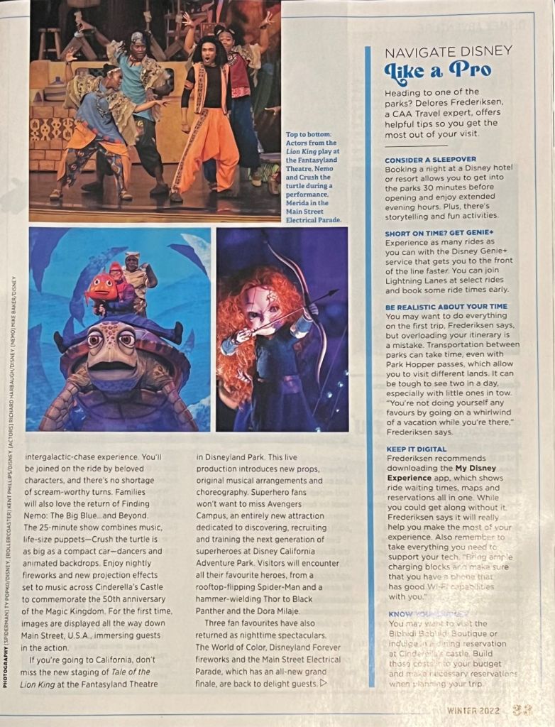 Pages 1 and 2 of the article focus on the 50th Anniversary of Walt Disney World, telling us about some of the new offerings within the Park. We are told to use a Travel Agent to plan ahead, and I can confirm that this is the only way to have a successful Disney trip these days. DO NOT go it alone! Next, we’re helped to determine which of the worldwide Disney Resorts would be best for our families to visit.