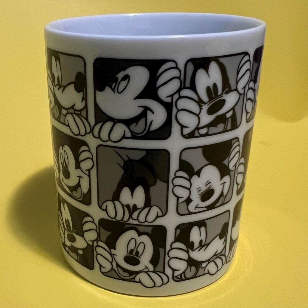 Sometimes the simplest designs can be the best. This basic black and white mug with Mickey and Goofy peeking out from squares arranged in a grid pattern is fun and imaginative:
