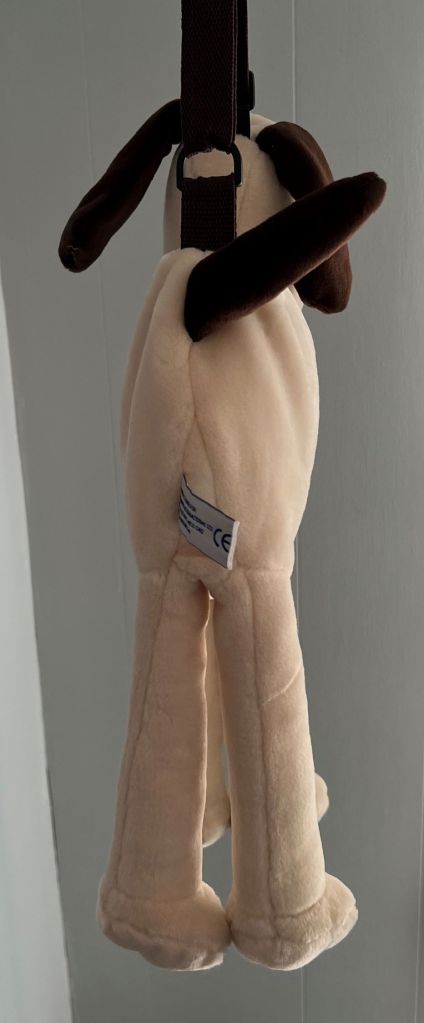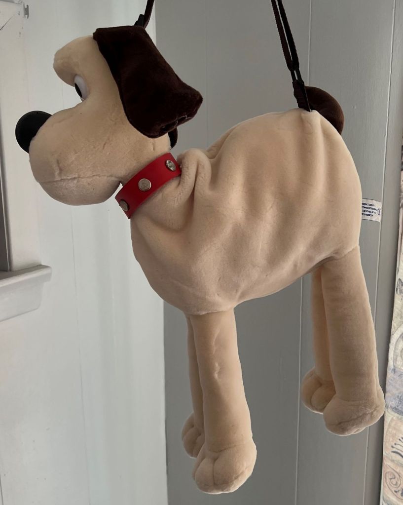 This Gromit shoulder bag is approximately 14″ long by 20″ high without the strap. It was made in 1989 by the Giftware International Ltd. company for Aardman Animations group.