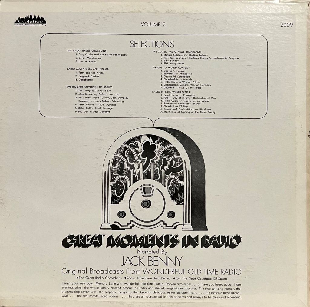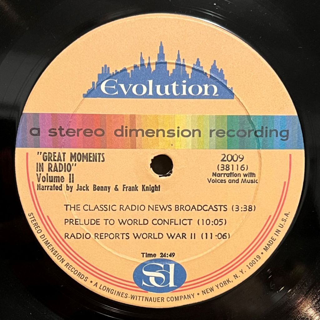 This LP record contains great moments in time from famous radio broadcasts that aired between 1936 and 1943. You may recall that the Second World War began and raged during this time period.