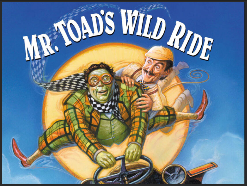 Mr. Toad’s Wild Ride attraction at Disneyland is an enduring classic dark ride that literally takes you to Hell and back. Well, to a version of Hell filled with flashing lights and cardboard cutouts. But before Mr. Toad inhabited this venue he was in residence at Toad Hall in Kenneth Grahame’s The Wind in the Willows (1908). Next he went for a frantic drive in Walt Disney’s animated package film The Adventures of Ichabod and Mr. Toad (1949).