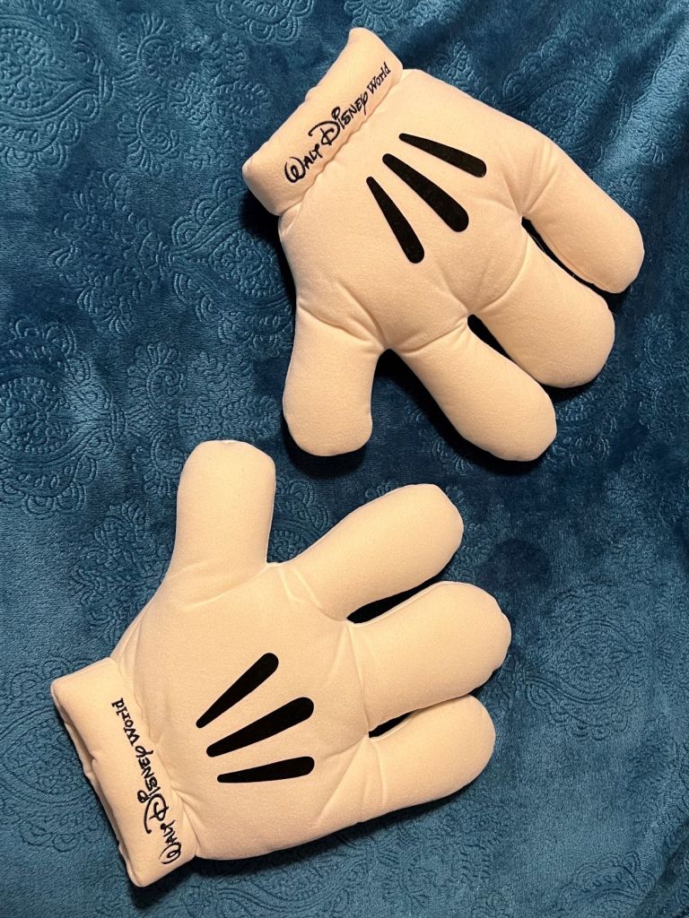 When we first flew to Florida and used the Disney Magical Express service, we were directed through the airport by Cast Members wearing pairs of these gloves. You could spot them from a great distance! The oversized four-fingered hands were a dead giveaway that you were on the right path.