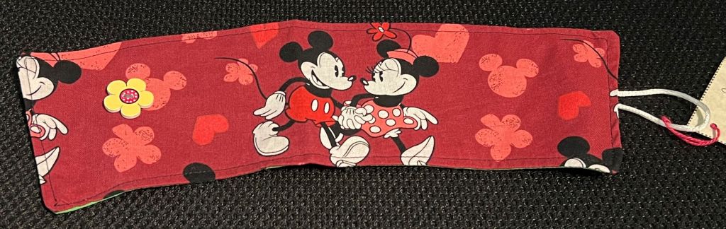 The fabric is likely a generic Disney pattern that can be bought at craft shops like Michaels or others. Karina then just cut it to size and shape and sewed it all together.