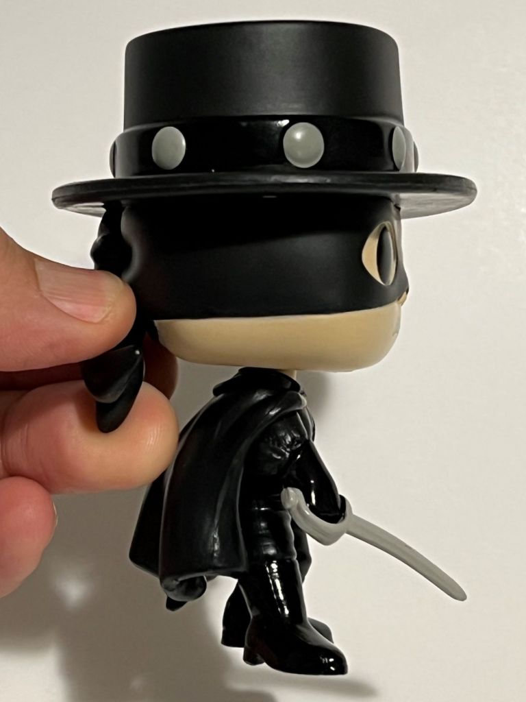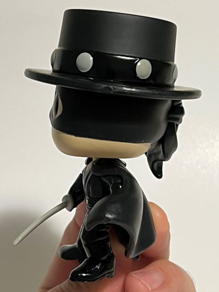 Unfortunately, poor Zorro has fallen victim to the Funko curse. His tiny little legs and feet just can’t keep his big head upright and he falls over if you let go of him. I don’t know why Funko can’t do more product testing before production to eliminate this annoying flaw!