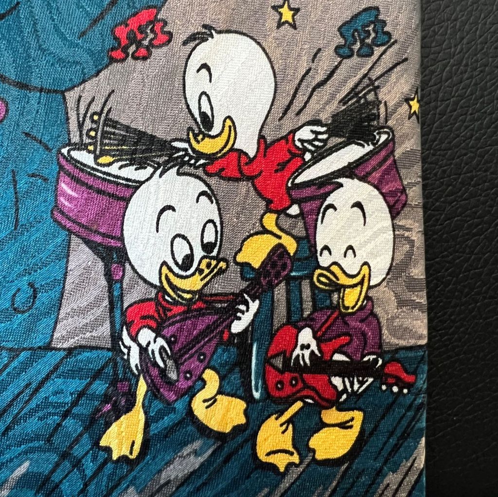The theme of this tie is music. To start, we have Donald Duck’s nephews: Huey, Dewey, and Louie. They are providing the instrumentation for this piece. Storyboard artist Carl Barks created the trio in the year 1937 to be comedic foils for their Uncle Donald.