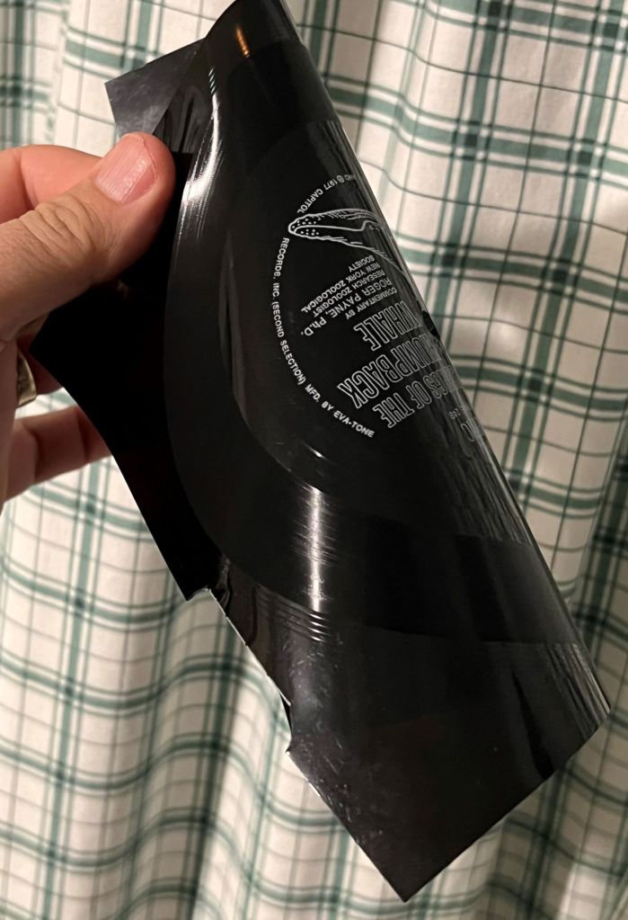 It’s really these songs that this flimsy vinyl ‘record’ was produced to share. It was included in the magazine as a free companion to an article written on the gentle giants of the sea. Specifically, the January 1979 issue, Page 24. The missing piece on the side of this example was likely created when it was removed from the binding of the magazine.