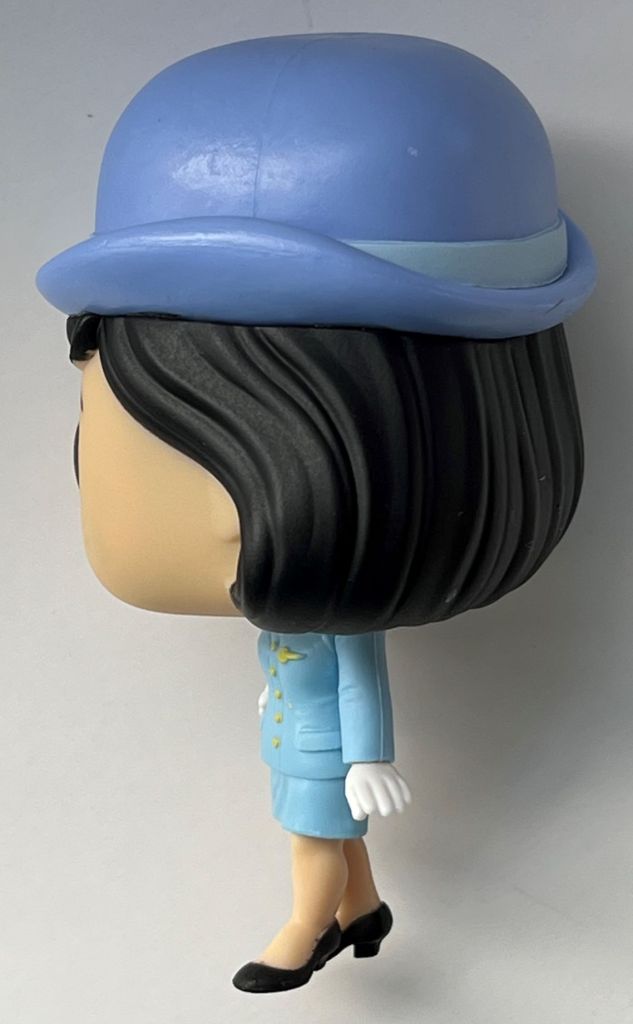 These gals can’t stand on their own two feet. No, they aren’t tipsy from attending one too many cocktail parties at 30,000 feet, it’s just that Funko insists on creating figurines with big heads and itty-bitty feet! For that reason, I am leaving them in the boxes and displaying them with my vintage airplane lamp: