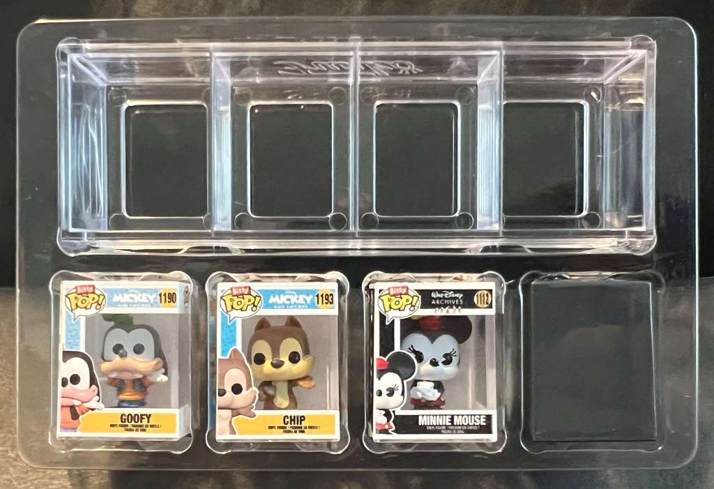 Each 4-pack comes with three characters you can see and one Mystery Bitty. None of the characters showing are Mickey but all four of the Mystery Bitty characters are Mickey. So you will always get him no matter which pack you buy. In a strange twist, they show you on the back of the packaging the four available Mystery Bitty figures, you just don’t know which one is in the box you have. You also get a plastic display case as shown in the pictures above. I will be putting them in my MINI Brands Disney Store display instead.