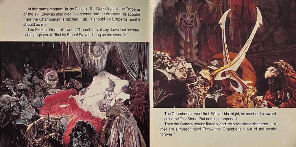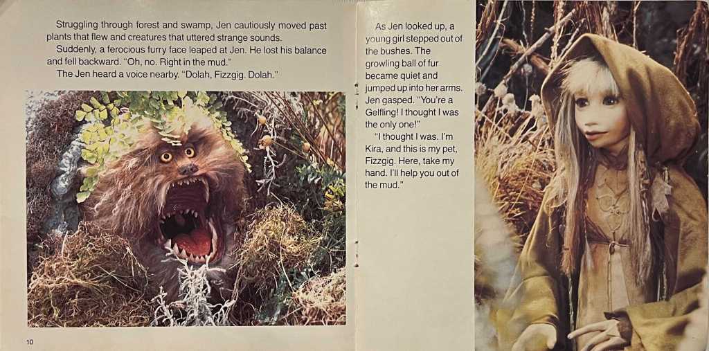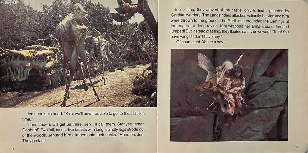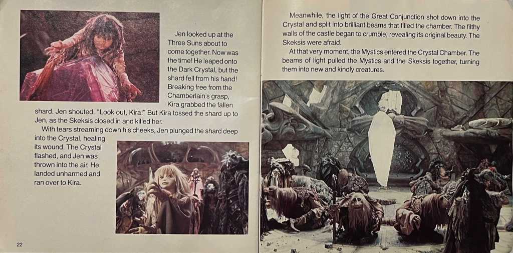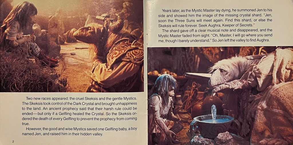 This story may have been a bit scary for some children back in 1982 if not so much today. But certainly it was an interesting piece of work! The plot revolves around Jen and Kira, two Gelflings on a quest to restore balance to the world of Thra and overthrow the evil, ruling Skeksis by restoring a powerful broken Crystal.