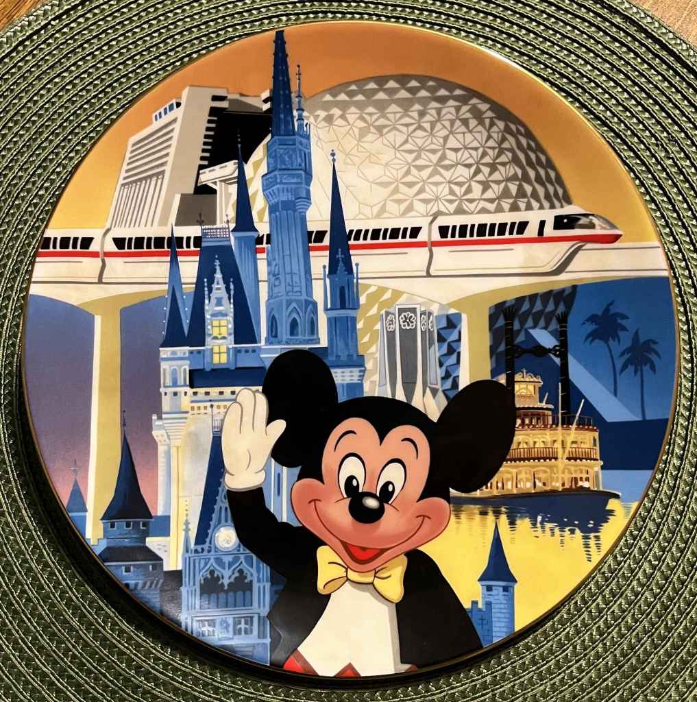 Icons that made the front of the plate are The Contemporary Resort, Spaceship Earth, the monorail, Cinderella Castle, the acrylic pylon Fountain (in front of Spaceship Earth, removed but now returned), the Liberty Belle steamboat, and of course, Mickey Mouse!