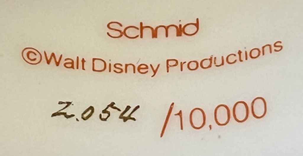 This was made in Japan and is numbered 2,054 out of 10,000 produced by the Schmid company for Walt Disney Productions.