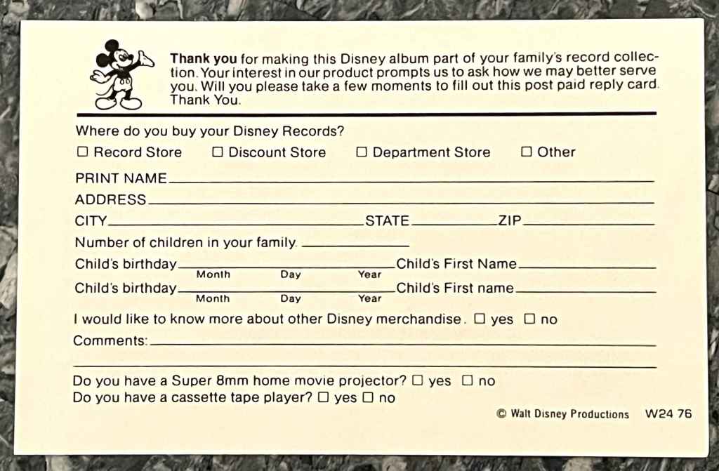 Notice you are asked if you own a Super 8mm home movie projector or an ultra-modern cassette tape player! Well, do you? Disney wants to know!