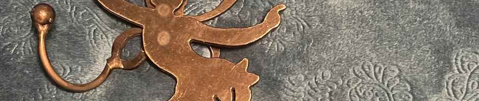 This is a very nice bronze three-point hanger that we now have on the back of our bedroom door. We hang our bathrobes on it. It measures about 8″ x 12″ tip to tip. The metal construction is also very solid and so Tink will be very durable for her new purpose of holding up clothes.