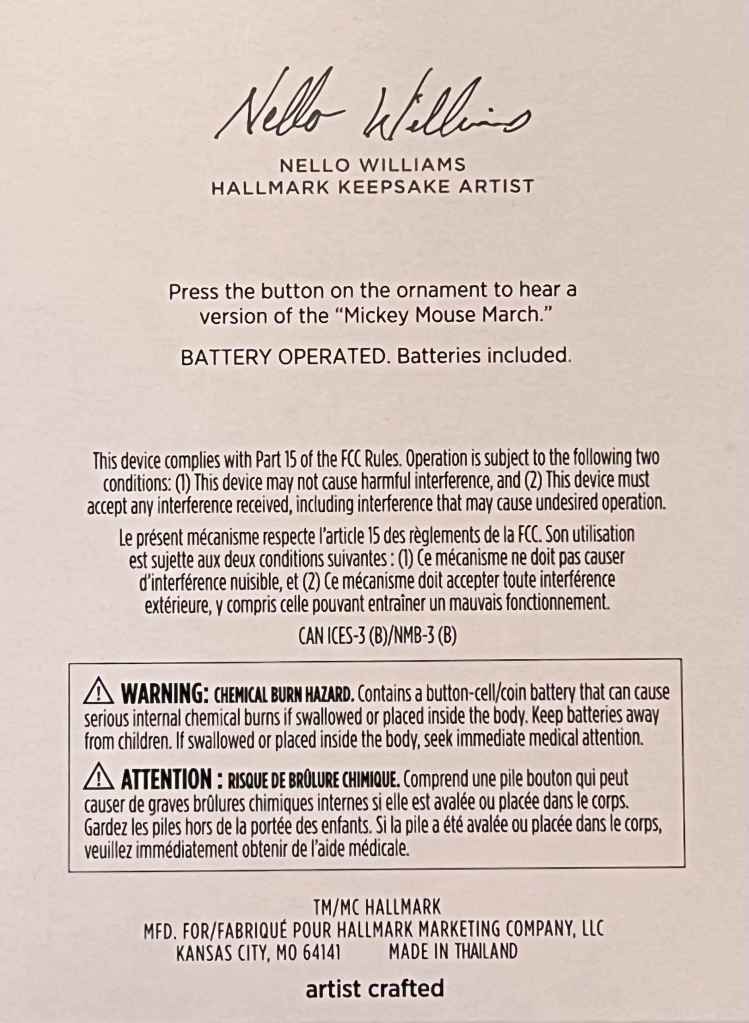 Nello Williams has created many fine Hallmark Keepsake ornaments. You can see two that I have featuring Mickey on a train and Mickey on a motorbike. Mr. Williams seems to like putting Mickey in fun situations!