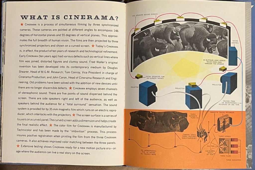 And no promotional book would be complete without a page or two of incomprehensible technobabble about the processes used to create the film. This book makes Cinerama sound like the greatest thing to hit movies ever, but other sources I read gave a more realistic view of the process. It was fraught with problems and didn’t last long. Not unlike Walt Disney’s attempt to create a new system for viewing his animated classic Fantasia, and how that failed to catch on, we have a similar situation where MGM boldly said ‘Hold my beer’… and regretted it.