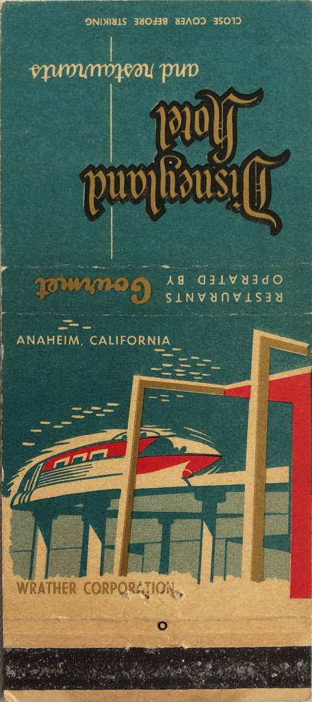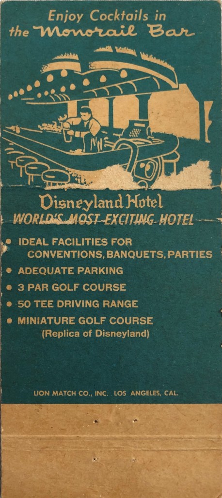 Another reason these matchbook covers are cool is because they often list features or attractions of the venue that may now be gone. The replica miniature golf course of Disneyland is long gone (apparently since 1978 or 1981). Pity. I’d still putt-putt there! The 3-par golf course and driving range was gone by 1969.